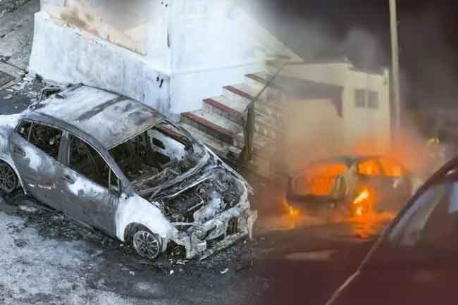 ඉන්පසු ඔවුන් දොරටුවට සහ පිටත නවතා තිබූ මෝටර් රථයක් අසල දියරයක් වත් කර, එය ගිනි තැබූ බව පැවසීය.