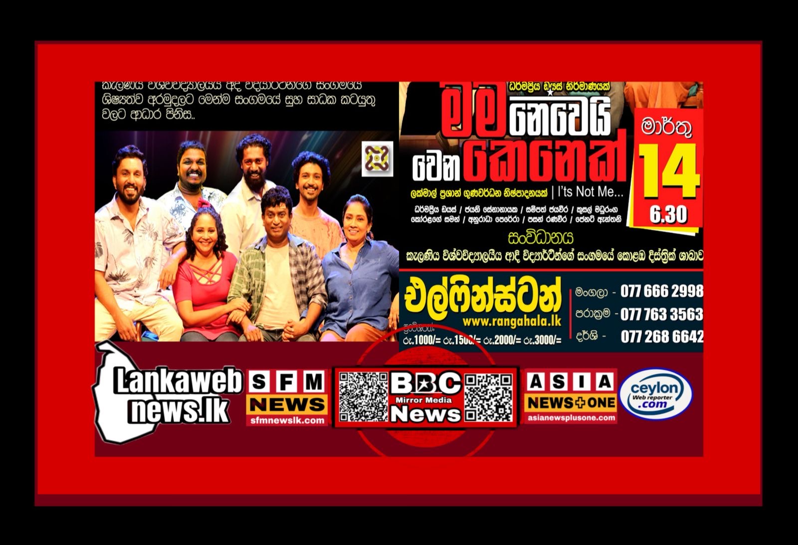 ඒ අනුව කැලණි විශ්ව විද්‍යාල කොළඹ දිස්ත්‍රික් ආදි විද්‍යර්ථින්ගෙ ශාඛාව 2026 මාර්තු 14 දින පස්වරු 6.30 ට මරදාන එල්ෆින්ස්ටන් රඟහලේ දි ධර්මප්‍රිය ඩයස් නිර්මාණවෙදියාගෙ